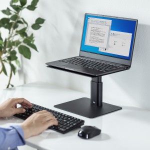 1本支柱タイプでスタンド下のスペースが広く、キーボードなどが収納しやすい高さ調整できるノートパソコンなどで使える卓上スタンド。